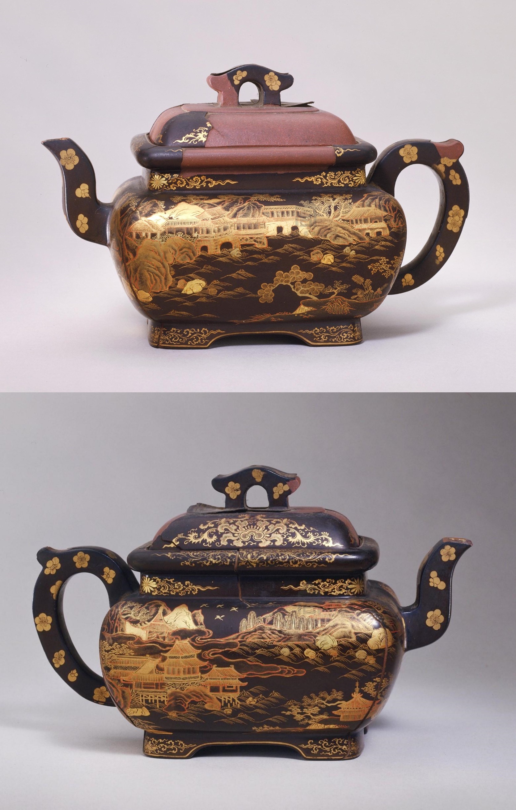 Yongzheng Period Square Zisha Teapot with Black Lacquer, Gilt, and Polychrome Painted Decoration