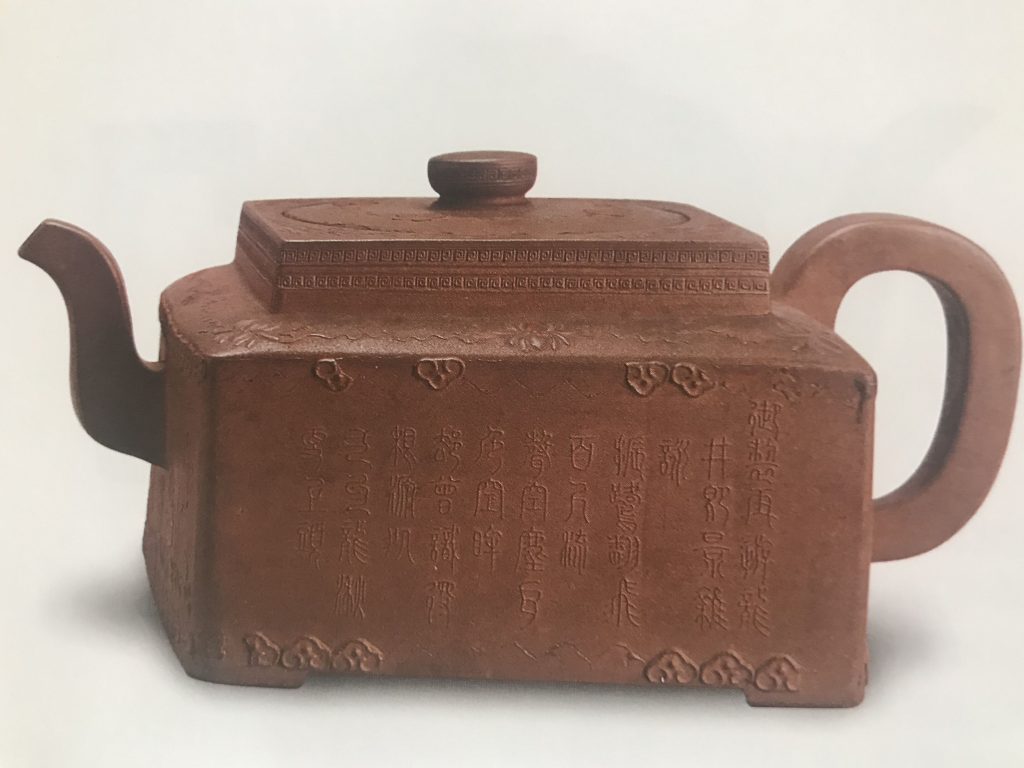 Only one surviving teapot is acknowledged as Imperial Yixing teapot in Ming Dynasty. It is entirely covered with carved lacquer, bearing the seal of the master potter Shi Dabin. Superficially, it resembles lacquer ware; only where the lacquer has chipped away is the purple clay body visible.